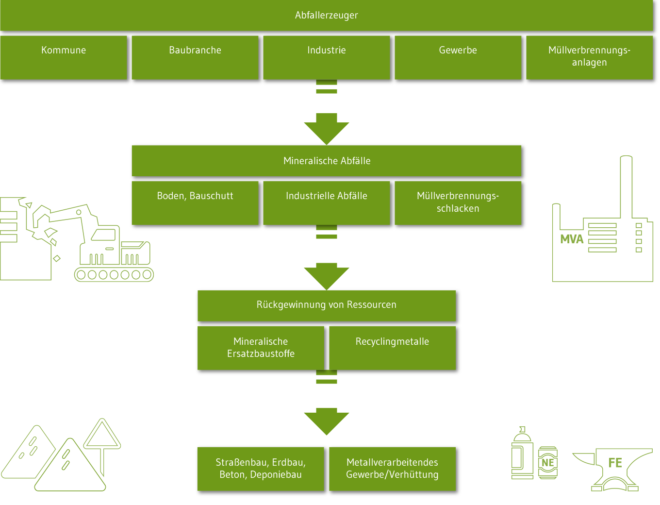 An unseren Standorten in Kassel, Habichtswald und Nordshausen schlagen wir jährlich ca. 300.000 Tonnen Boden und Bauschutt um. Aus dem Eingangsmaterial produzieren wir hochwertige Recyclingbaustoffe für den Einsatz als Baumaterial. Zusätzlich sind wir Aufbereiter von ca. 50.000 Tonnen industrieller Abfälle pro Jahr, darunter unter anderem von Rostaschen aus der Müllverbrennungsanlage in Kassel. Bei der Aufbereitung in unseren Anlagen gewinnen wir wertvolle Metalle zurück. Die verbleibende Mineralik können unsere Kunden im Straßen- und Erdbau einsetzen. Das schont den Abbau natürlicher Ressourcen und reduziert die Deponiemengen.